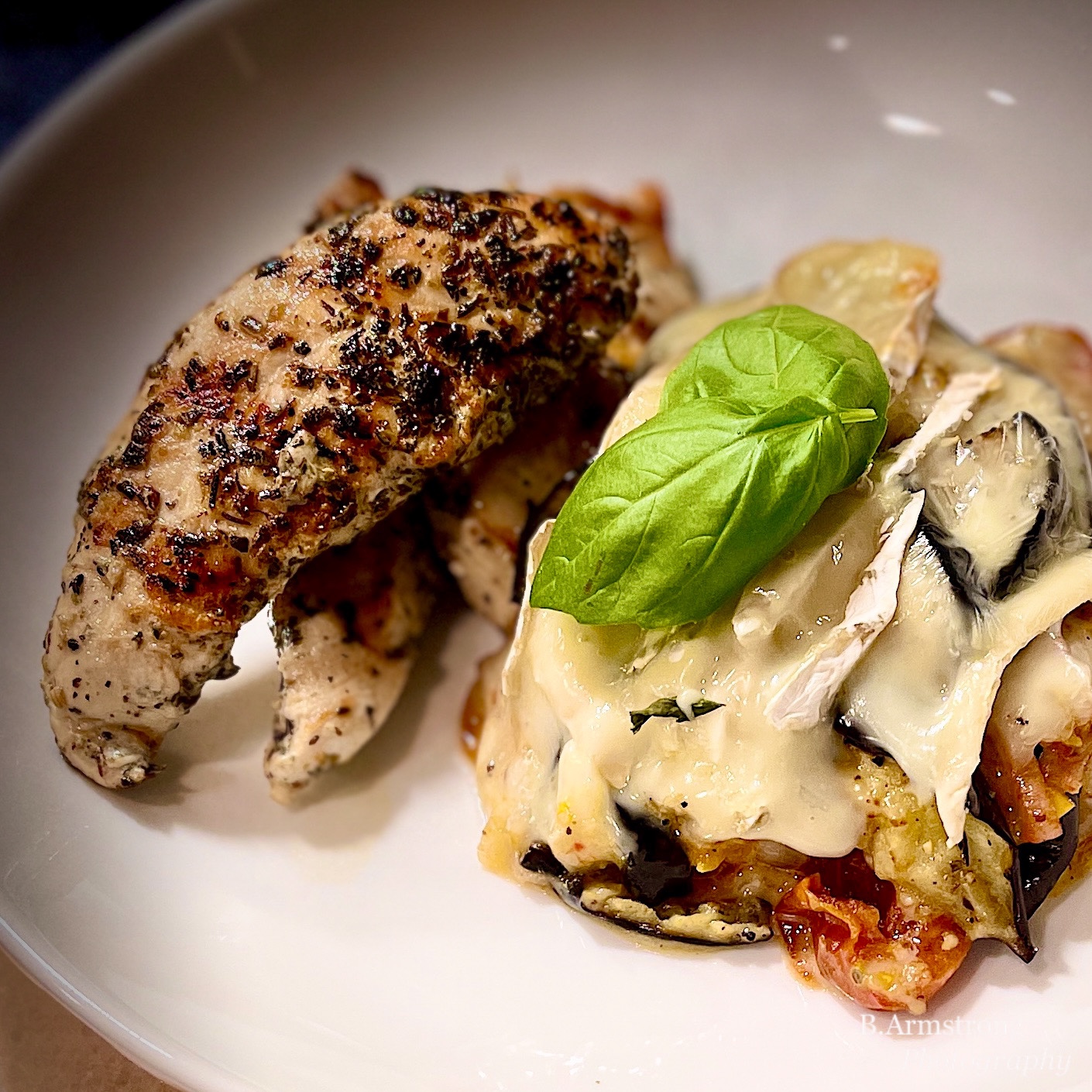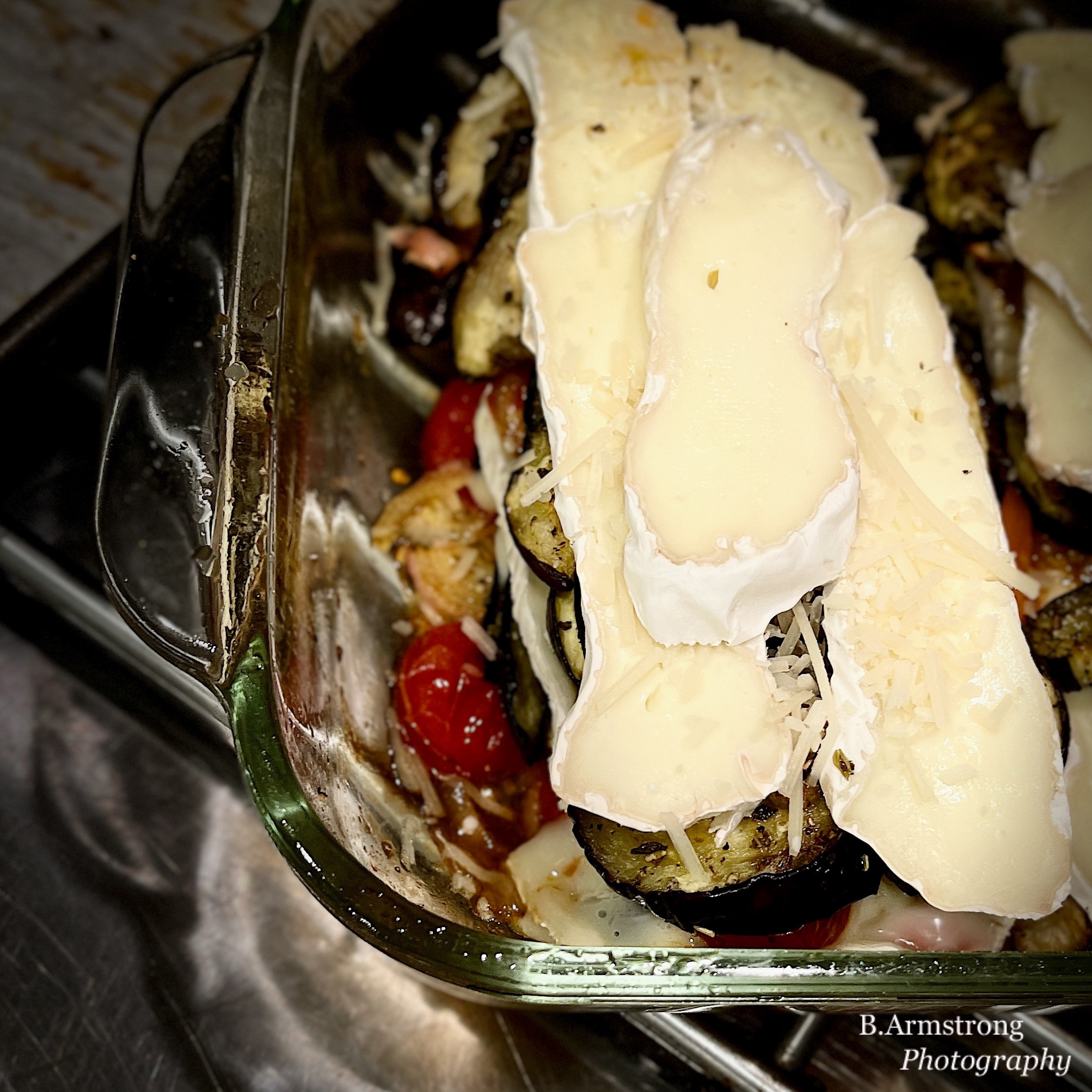 When the roasting is complete, in a small baking dish construct 3 layers, ending with Camembert: 1/3 tomato mixture, 1/3 eggplant slices, 1/3 Camembert slices and a sprinkle of Parm.