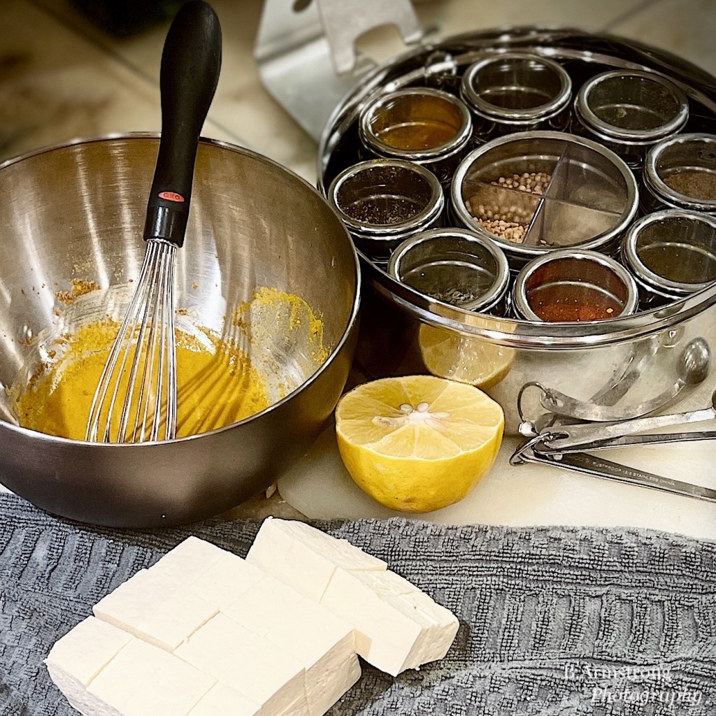 When dry, dice tofu into 3/4” cubes.Combine lemon juice, turmeric and 1 Tbs. Vegetable oil to make a marinade; add tofu and toss to coat. Set aside.