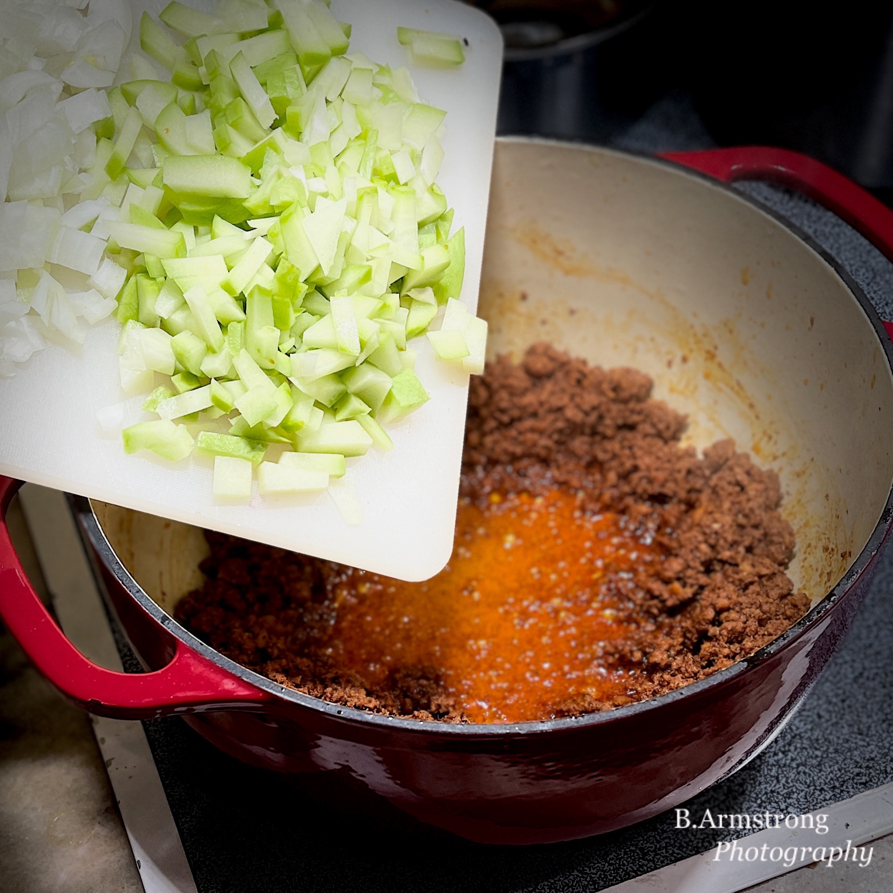 Heat a tsp of oil in a large high-sided skillet or Dutch oven set to medium-high. Crumble in the chorizo, breaking it up as you sauté for about 5-7 minutes. Move the cooked sausage to the sides and add the onion, chayote and garlic into the center where the oil has pooled. Sear the vegetables for 3-5 minutes, season with salt and mix thoroughly into the sausage. Reduce the heat to medium and cook covered for about 15 minutes. The doneness test is the chayote – when they are slightly softened you are good to go. Remove from heat to cool.