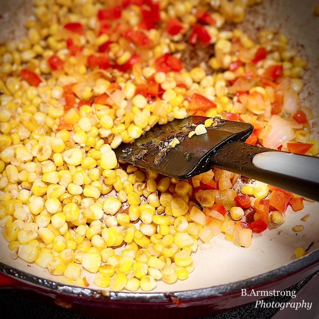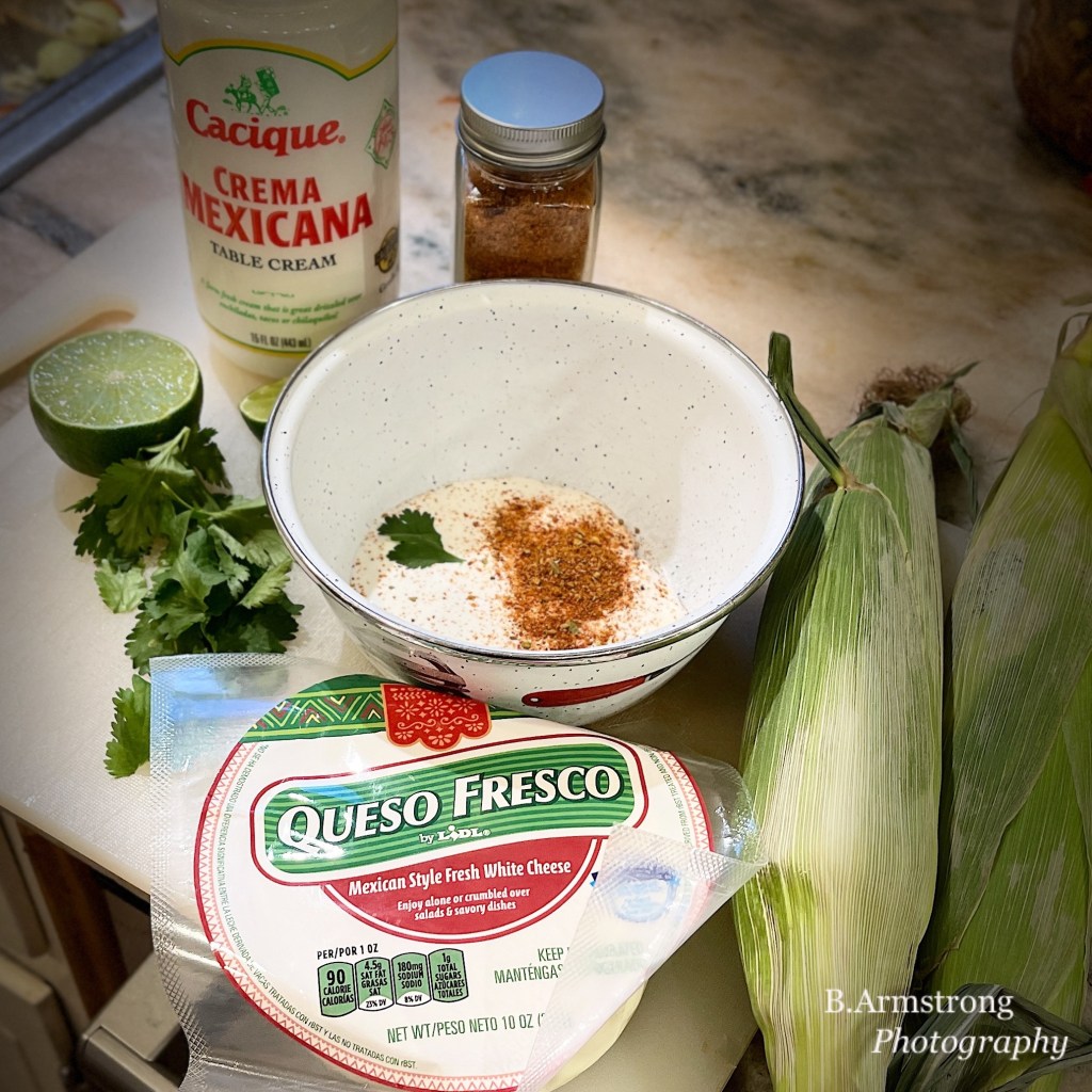 On medium high, sauté onion and red bell pepper in oil. Cut the kernels from corn and add to veggies, slightly increasing the heat. Stir constantly to sear, about 8 minutes. You want the corn to brown on the edges. Again, you can grill the corn and then add charred kernels to the veggies. Make a sauce with Crema Mexicana, chili powder, lime juice, salt and chopped cilantro. Toss and top with queso fresco – serve warm or cool.