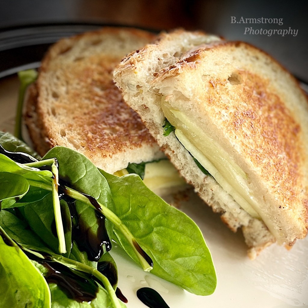 Heat grill pan or griddle to a feisty medium. Butter one side of each slice of bread and place on grill. Add thin slices of Emmentaler to cover the bread surface. Repeat with apple slices, spinach and Gruyère. Top each sammie base with bread buttered on the outside.