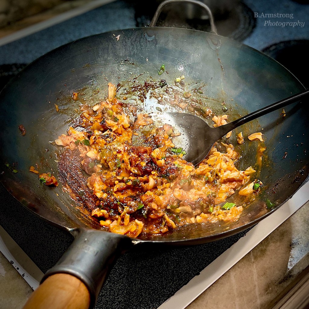 Heat your wok to a vigorous medium-high and add the chopped bacon. You will want to stir fry slowly to crisp the little edges and render the fat.