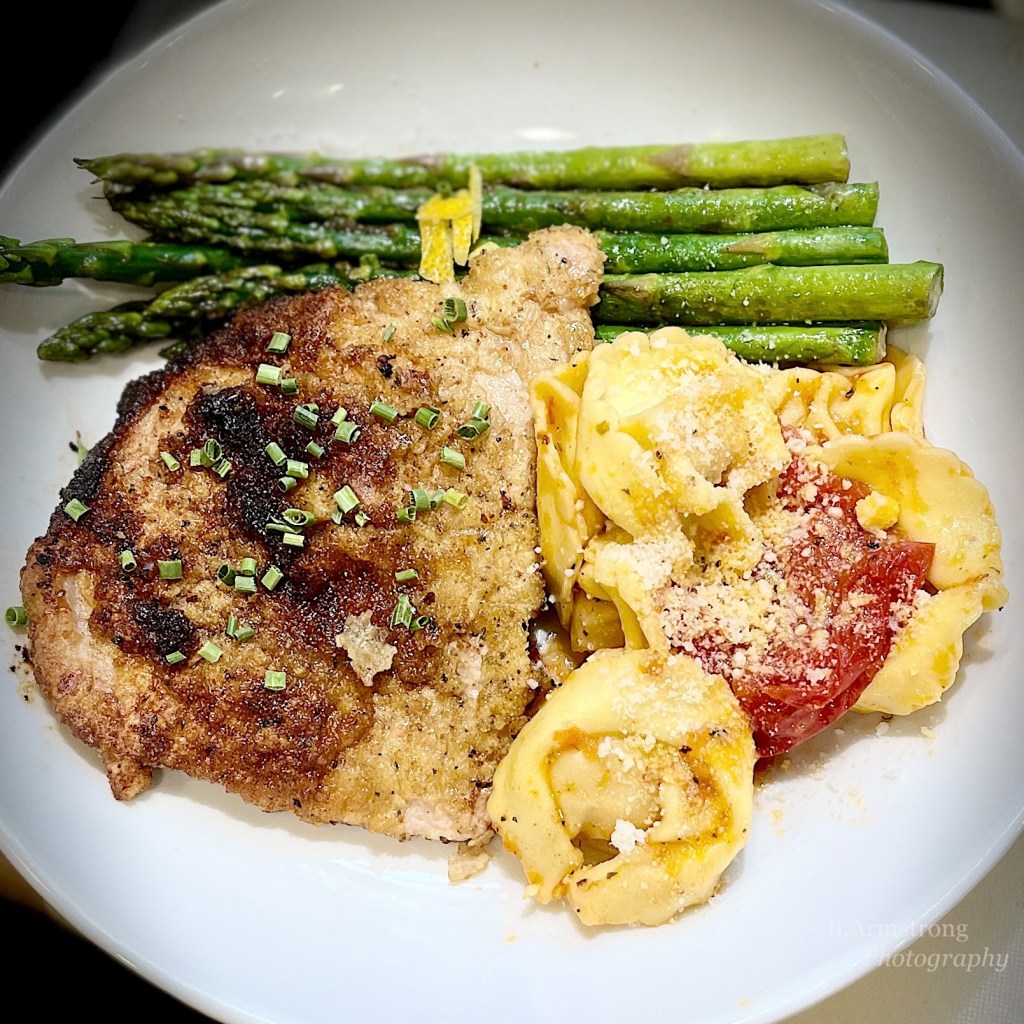 I think cast iron or carbon steel pans give a better scald than the fleet of Teflon I threw out last year. Proper heat and an oil-butter duet are all you need and deglazing with wine or chicken stock pulls up any clingy yum-yums to make a light, savory sauce. Asparagus pan-grilled in butter and some amped-up tortellini and finished the plate. It really could have been a roll, but I wanted an insurance policy. This happens when I worry something is going to be yucky – yep, the pork chops. But I totally didn’t need the tortellini this time. Chops were swell.