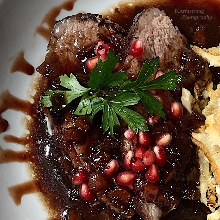 I love my brisket, I really do, but growth requires change…plus I found a giant boneless leg in August at 30% off which I froze with a big label reading “for Rosh Hashana.” I chuckled with satisfaction and anticipation every time I opened the freezer. This recipe, based on Ina Garten’s Four Hour Lamb, is quite similar to my brisket – a yummy sweet and sour sauce infusing tender, flavorful meat. The lamb was rich and succulent to begin with, so braising in red wine, herbs and pomegranate juice took it into the decadence category. There are other versions of this lamb that call for pomegranate molasses, a syrupy reduction much like a balsamic glaze. I made that too (duh) but judiciously swirled it around just the rim – talk about gilding the lily.