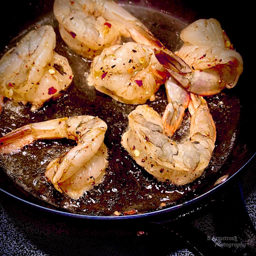 I almost made it exactly the way she wrote it. It seems I have acquired a pet peeve when it comes to seafood in pasta dishes: if I wanted boiled scallops or squid or shrimp, and I cannot imagine why I would for pasta, I’d actually boil them. But too many of my shellfish dinners have looked pale, rubbery and flavorless because the little critters were simply steamed in the sauce. Butter and olive oil added to a small pan on high heat fixes that in less than two minutes. Fearlessness is a prerequisite for this method – you must be brave enough to toss your precious shrimps into searing hot oil and disciplined enough to get them out in time. And turn the vent on.