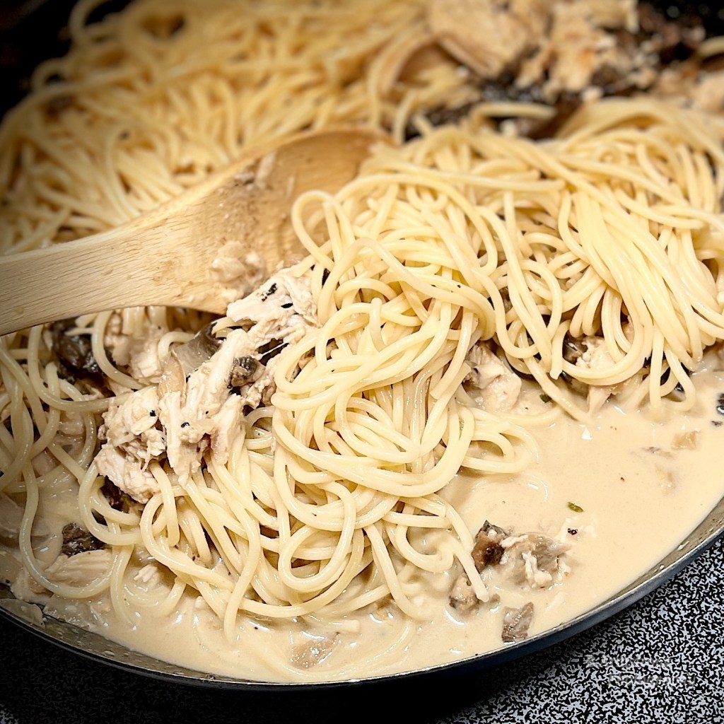 Add the shredded pulled turkey and white sauce to the mushroom mixture and toss gently to combine.