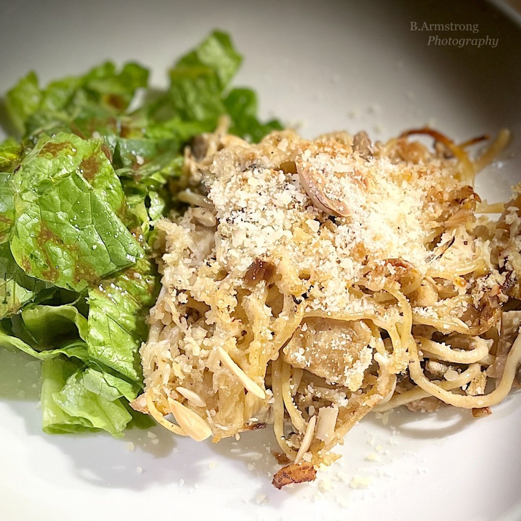 In the late eighties, our family Thanksgivings took an interesting turn in the spirit of both rebellion and convenience. Somebody’s mother declared: “Nobody wants all that turkey and stuffing” and that was the end of that. Instead of a traditional holiday meal, it was determined that Turkey Tetrazzini and a giant green salad were close enough. Mother and Tante A. (sisters-in-law and conspiratorial best friends) would each make a version of the creamy turkey and noodle casserole in place of roast turkey, stuffing, etc. They were equally delicious and we were all perfectly free to choose, but I knew better than to betray my maternal bloodline. Unlike many recipes that are floating around, there were no peas or carrots, but plenty of ‘shrooms, a healthy dose of Parmesan cheese, and distinct hints of nutmeg and sherry.