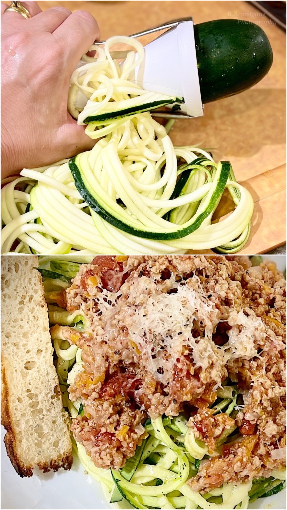 The Vegetti sounds like something from an SNL skit, but is in fact a very well-designed spiral-izer for veggies like zucchini and yellow squash. Think vegetable + spaghetti = vegetti. But go ahead…say it out loud. My own unbridled giggling didn’t stop me from announcing that I was “bringing out the Vegetti tonight” a dozen more times than necessary that day. The men of the house refused to say the word and I was becoming obnoxious. Allegedly.