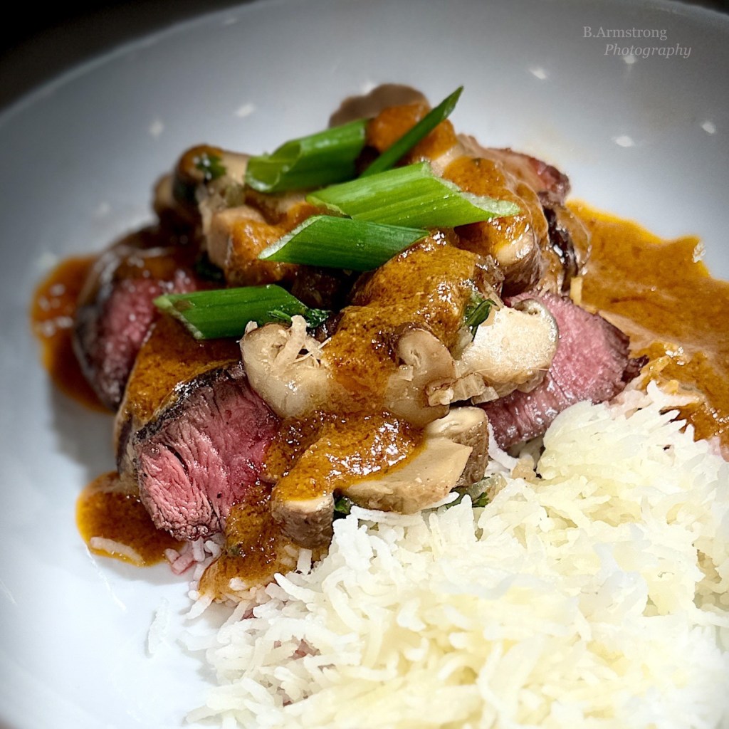 Stir in any accumulated juices to the skillet. Simmer until heated through, about 1 minute. Slice steaks on the bias and layer onto to a serving dish. Top with mushrooms and spoon sriracha butter sauce on top. Garnish with sliced scallions and serve with rice or warm bread, depending on whether you’re feeling Japanese or French at the moment.
