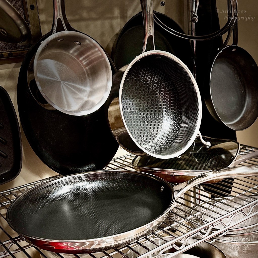 But because I do trust my friends implicitly, I took it all to heart and implemented my own brand of self-care. First, I gathered up all my knives to be sharpened. Don’t laugh, that made me extremely happy, dare I say giddy. Next, I upgraded my kitchen storage, rearranged the prep table situation, and added additional shelving. Since I can’t see a damn thing I switched out all the recessed bulbs in the kitchen to double the lumens – 1600 and I now can see everything. Unfortunately, now I can see everything. My final splurge was a couple pieces of overpriced, hybrid cookware I’d been drooling over for months.