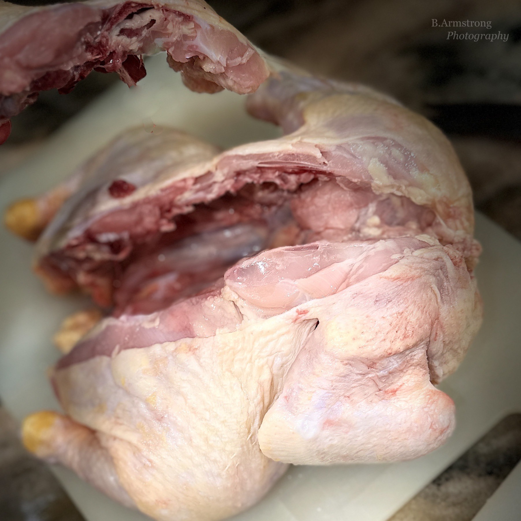 Sorry this is gross, but important to see the actual slaughter technique. Once you’ve snipped up either side of the backbone, remove it to expose the cavity. The portion you remove will be about an inch wide. Save the backbone for stock or if you are gagging like me, quickly dispose. The idea is to minimize the depth of field and create a more compact plane of meat. It’s really a dream for both the convection oven and the grill.