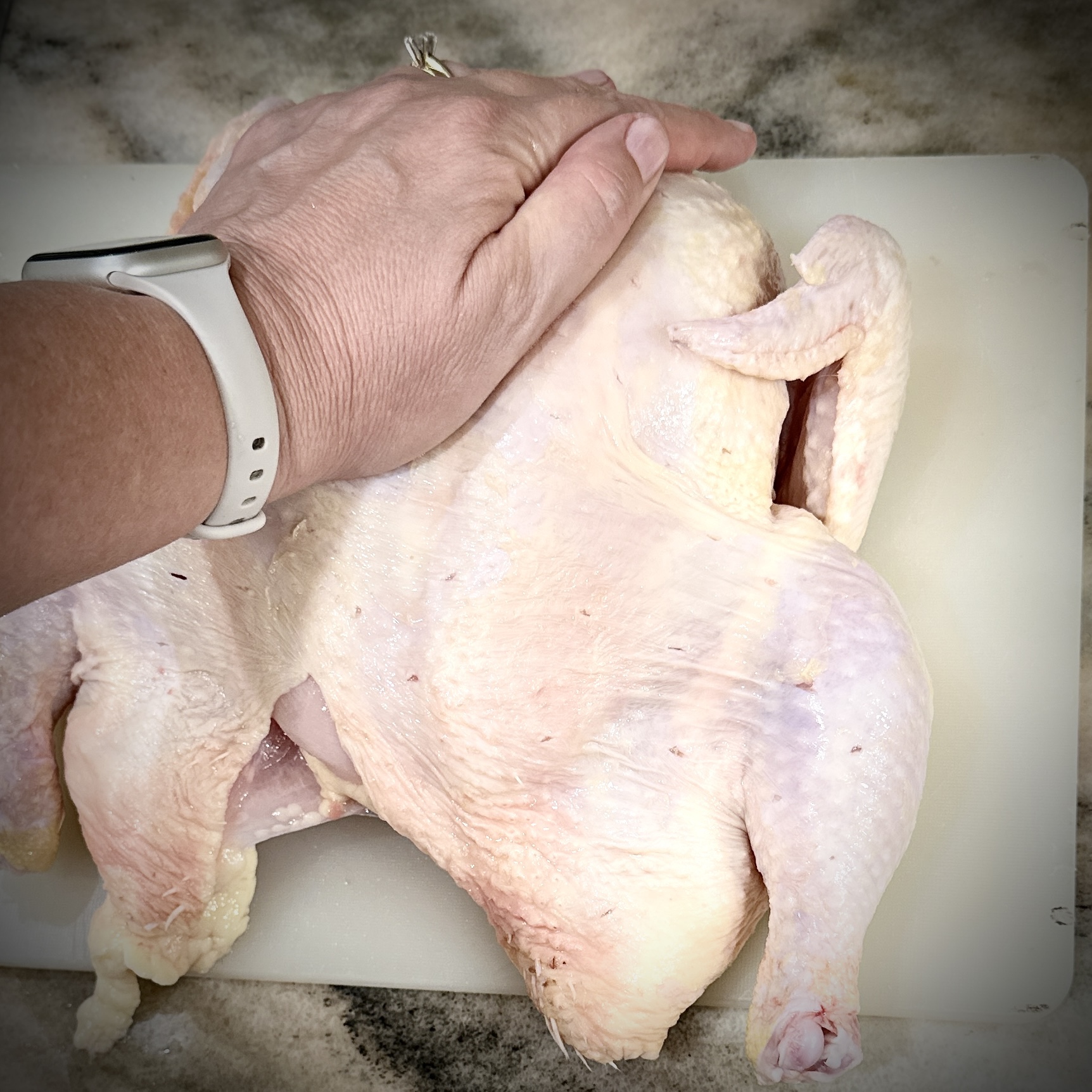 Rinse and pat dry your chicken, especially the cavity. Flip it over so that the breast is facing down. You will now be able to feel the backbone. You can precut with slits down either side of the backbone as markers if you are freaked. Then use kitchen shears to snip through the skin, meat, and small bones along either side of the backbone. It’s a crunchy, destructive minute or so, but not bloody – you can do it.