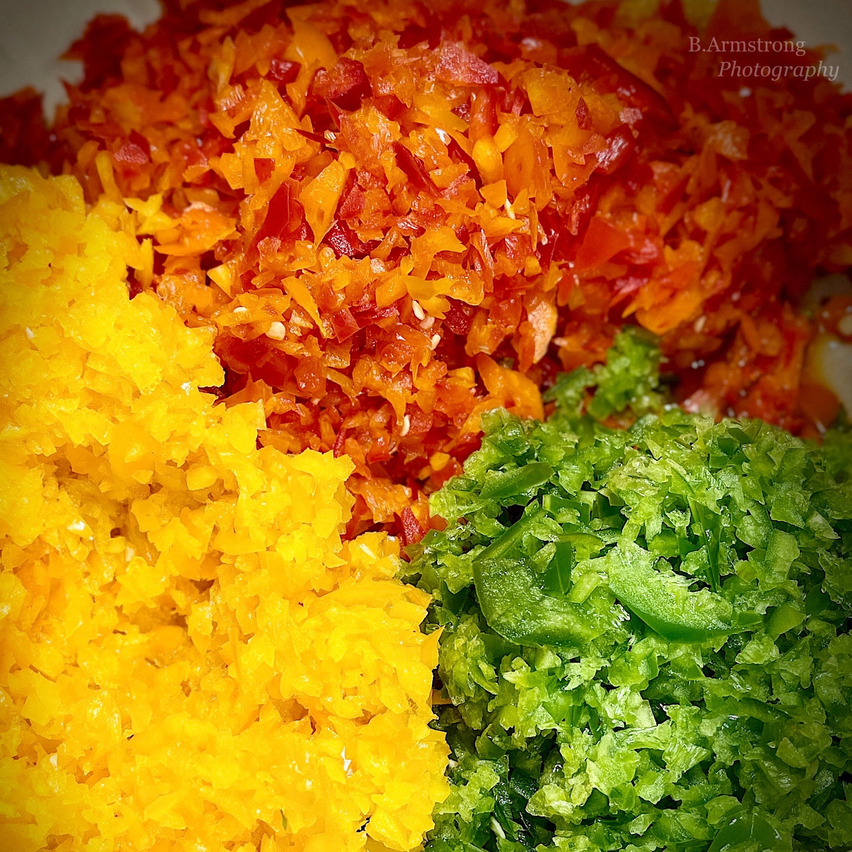 - 1/4 cup each diced yellow, red, and green bell peppers (I used poblanos instead of green because I hate them)