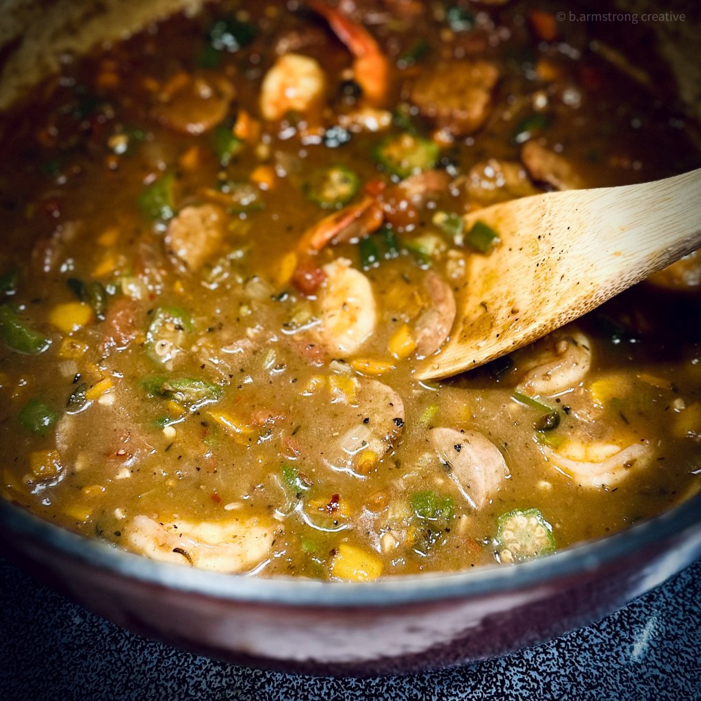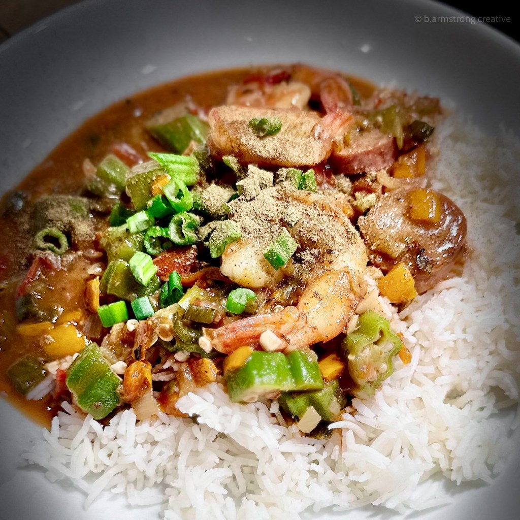 Growing up in the South, gumbo on white rice was a fairly routine supper, but not because of any particular fealty to New Orleans. Savannah gumbo was more Geechee than Creole, made from local ingredients on hand: shrimp, onions, celery, tomatoes, and okra. Unlike Creole gumbo, there wasn’t a heavy, dark roux component – it was the okra’s job to thicken the stew. It was practically health food.