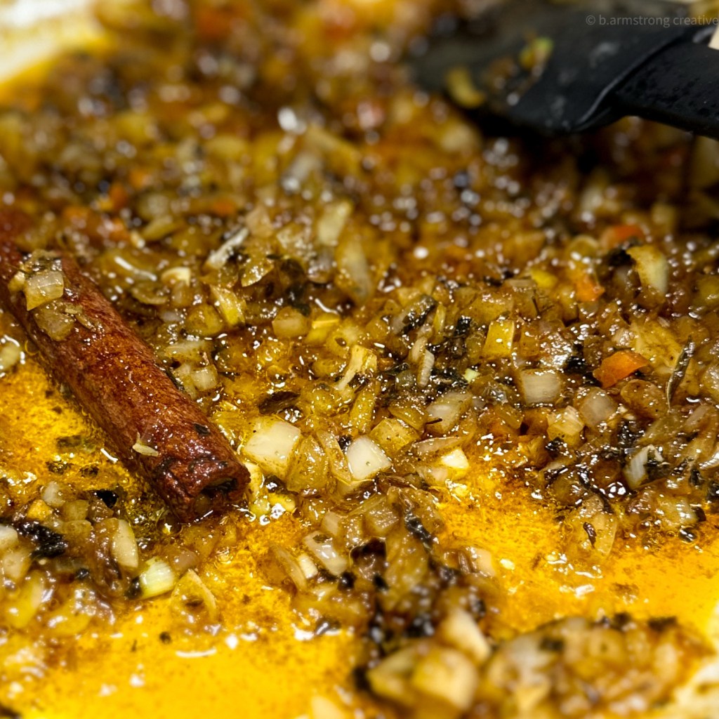 - Adjust heat to medium and add bay/curry leaves, cinnamon stick, cumin seeds, Serrano pepper, and onions. Sauté for 7-8 minutes, lowering the heat if you sense any burning.