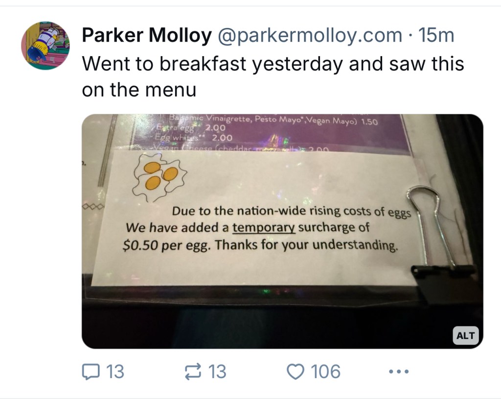 Nevertheless, I hear an awful lot of chatter about the price of eggs, and for good reason. According to what’s left of the U.S. Department of Agriculture, it’s expected to increase over 40% in 2025. We are facing a long period of economic uncertainty and eggs will remain emblematic of a continuing crisis – currently, there are $7 cartons in Atlanta and $7 “loosies” or single eggs being sold in NYC bodegas. Because eggs are in so many baked goods, those costs are going up along with restaurant prices, in the form of surcharges. That’s just great. You can think of it as a harmless little domestic egg tariff if it makes you feel better, but we are all going to have to make some choices. Unfortunately, we are an egg-loving household.