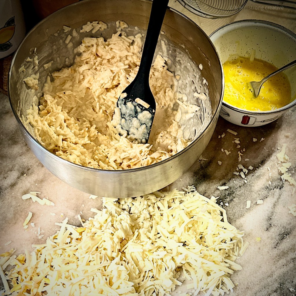 Pour into the buttered casserole dish and top with remaining 1/3 of shredded cheese.