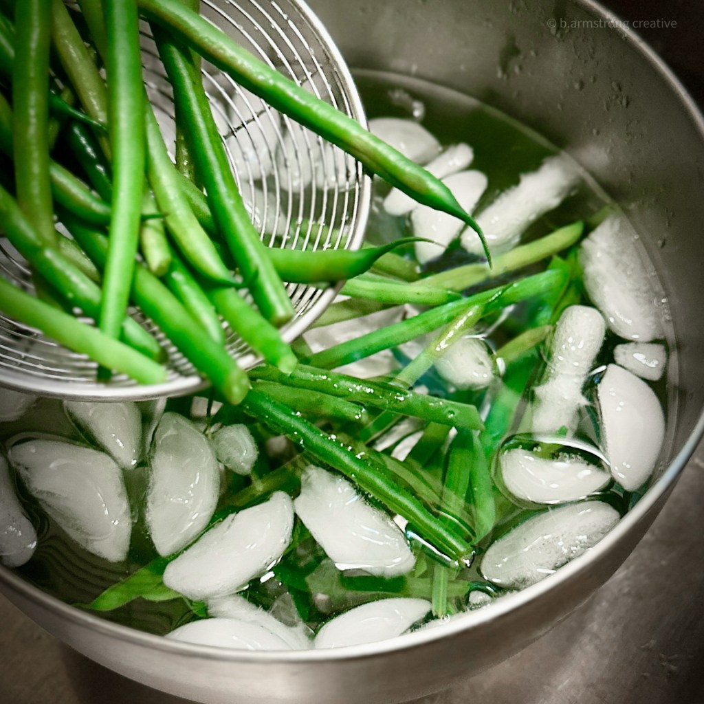 Important: once cooked, immediately plunge the green beans into an ice bath. Drain when completely cooled.