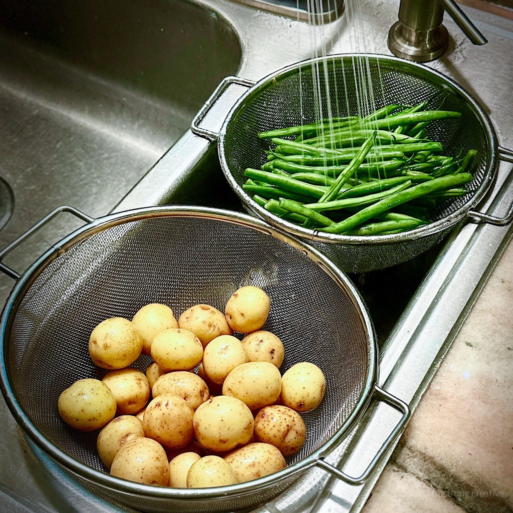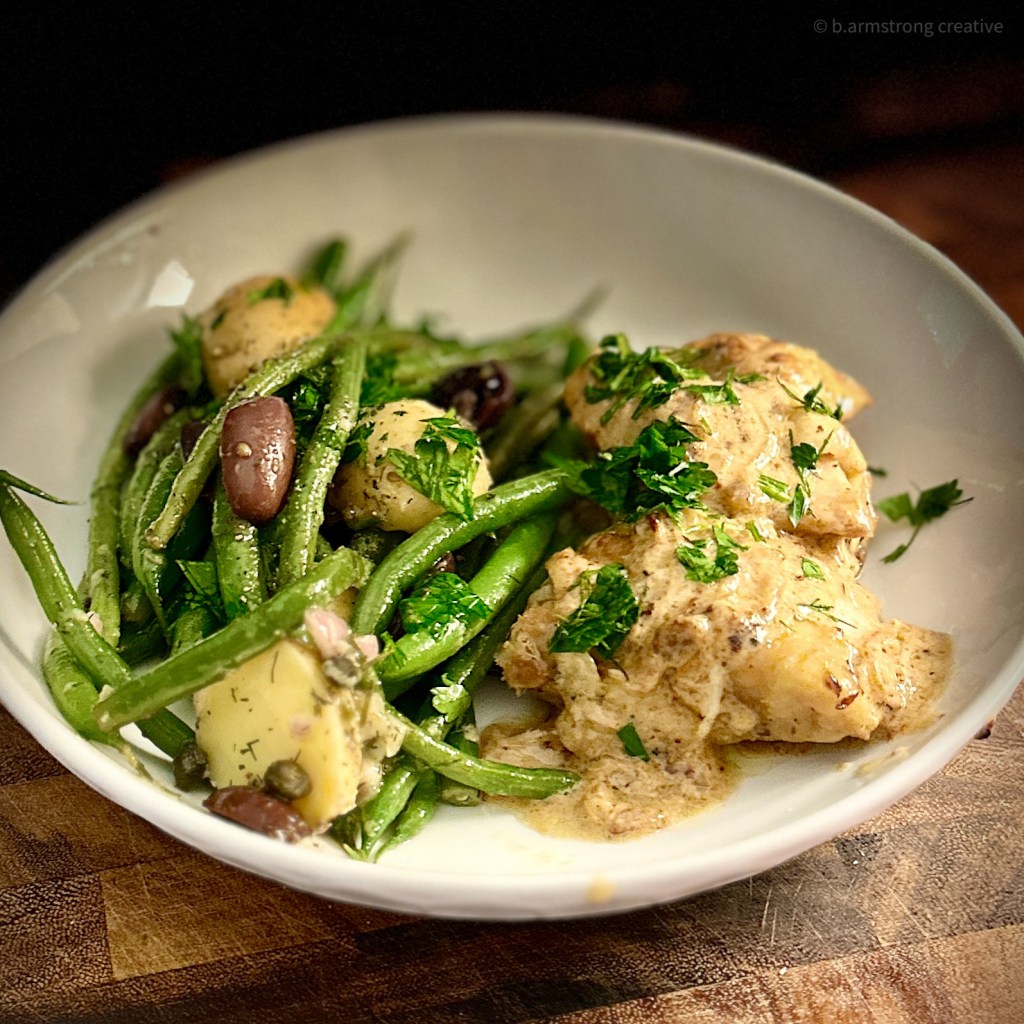 This salad could be considered the foundation of a Niçoise and would easily support tuna, eggs, and cherry tomatoes. But when paired with herby, briny potatoes, these greenies bring a full symphony of flavor as is. Also, it is a perfect pairing with a creamy French chicken such as Poulet Gaston Gerard.