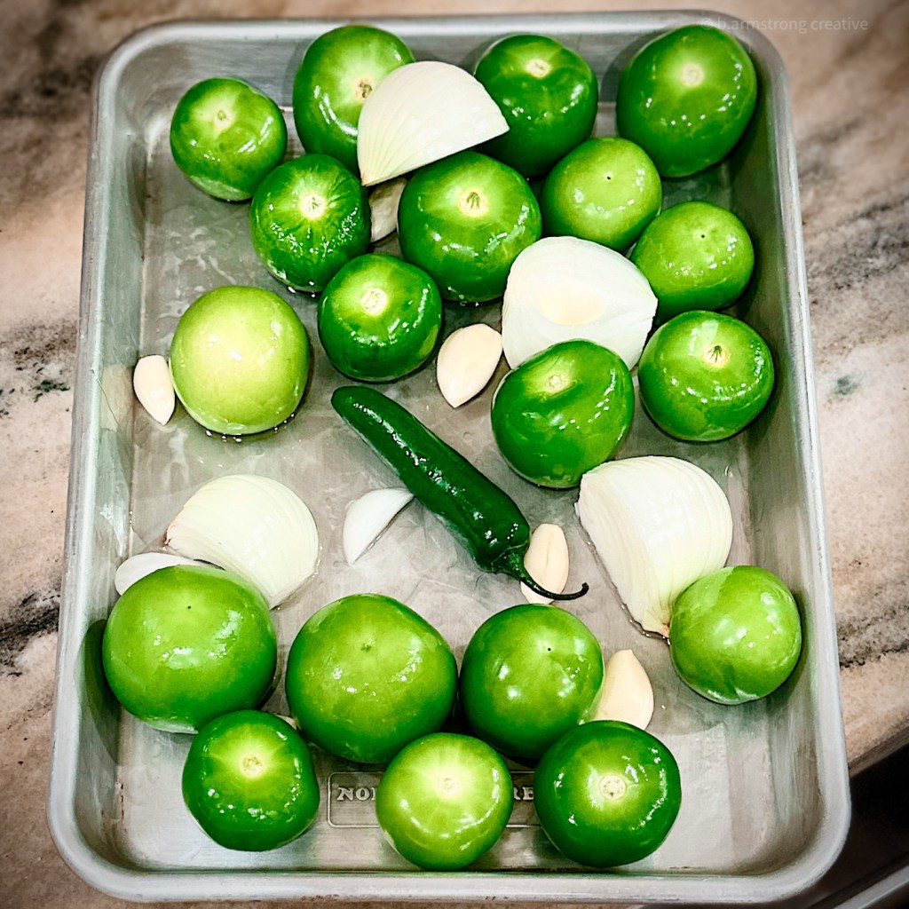 Preheat oven to 425° and place tomatillos, onion, pepper, and garlic on a lightly greased sheet pan. Roast for 30 minutes until soft and slightly charred.