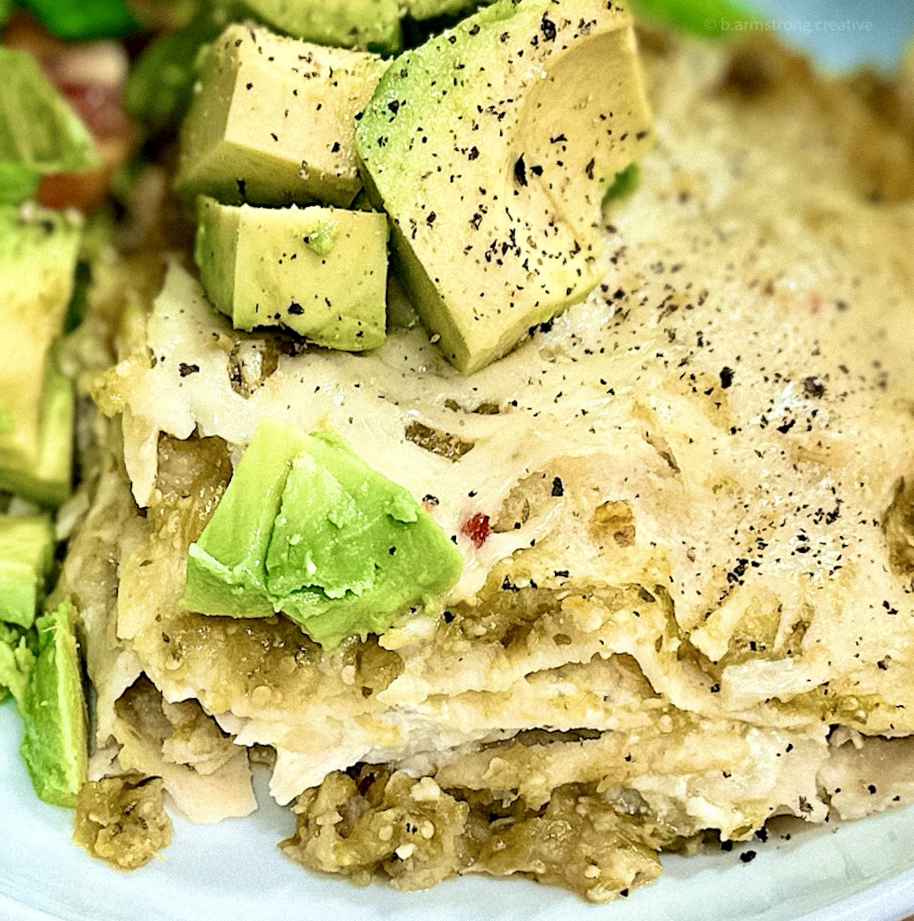 There are dozens of variations for this dish: flour tortillas, red salsa, shrimp or fish could all work. The fat content of the white sauce is up to you, just realize that it ultimately blends with the salsa to soothe the sting of the chilis and mellow the tart tomatillos. Lastly, I chose not to roll them individually because the corn tortillas always break on me unless I warm them in oil, so that’s out until somebody’s statins kick in.